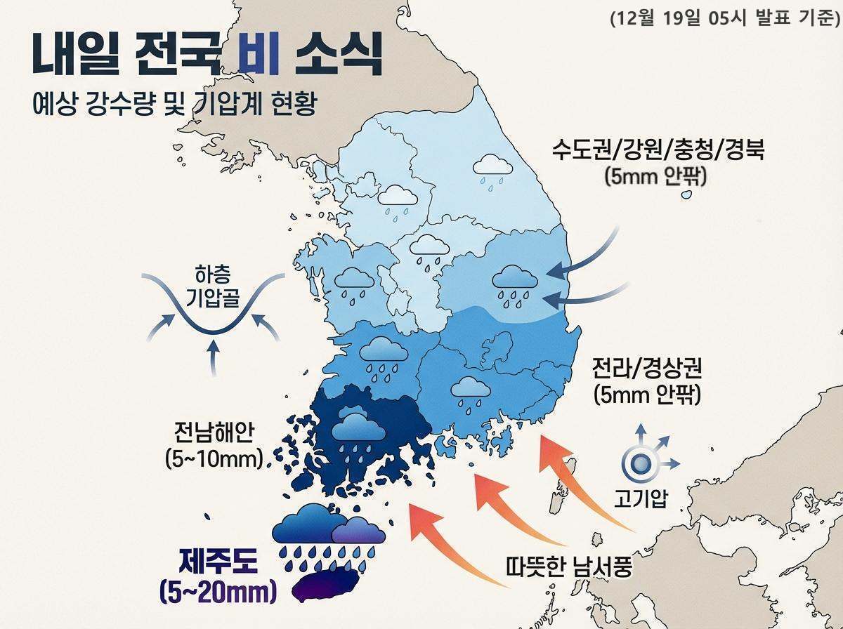 본격적인 비 소식은 토요일인 20일에 전국으로 확대된다. 새벽 시간대 중부지방과 전라권, 제주도에서 비가 시작돼 오전에는 경남과 경북 서부로, 오후에는 경북 북부 내륙과 북동 산지까지 확대되겠다. 예상 강수량은 제주도가 최대 20mm, 전남 해안은 5~10mm, 서울을 포함한 그 밖의 지역은 5mm 안팎이다. 중부지방은 늦은 오후, 남부지방은 밤에 대부분 비가 그치겠다.