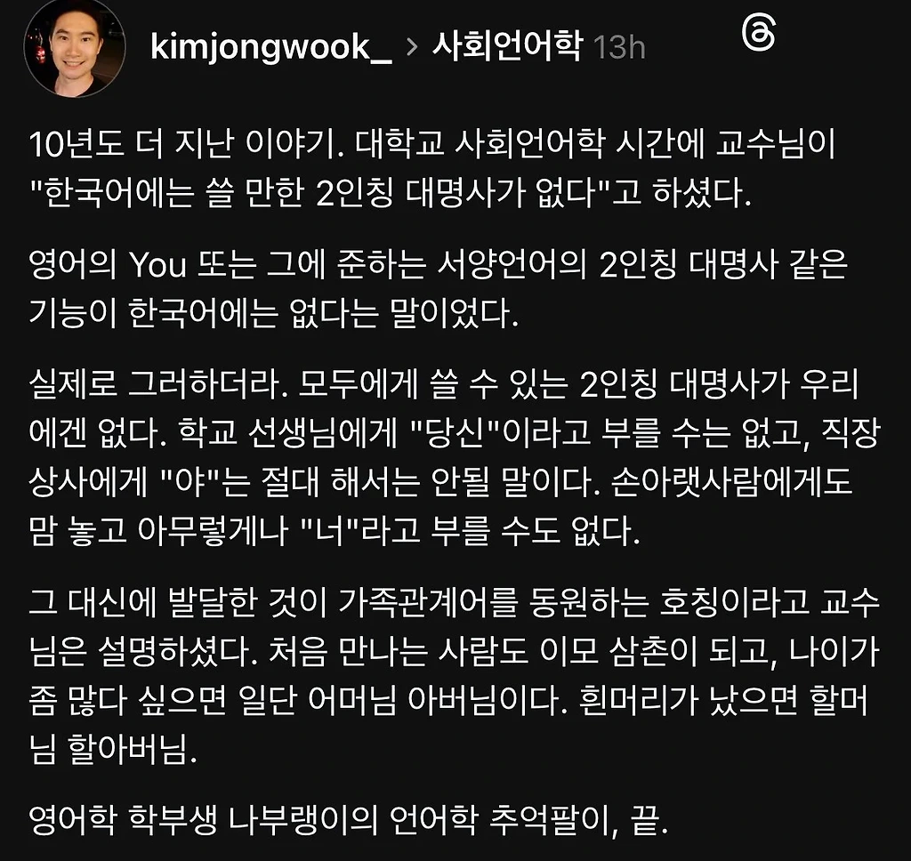 한국에는 쓸 만한 2인칭 대명사가 없다