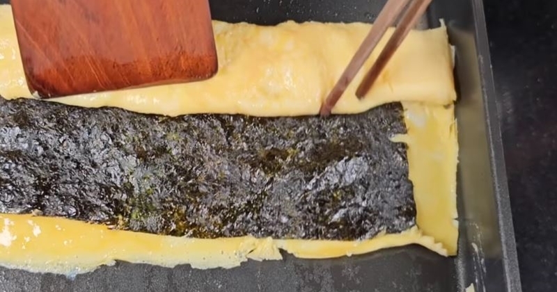 팬에 기름을 두르고 계란물을 얇게 부어 익히기 시작한다. 반쯤 익었을 때 들기름을 바른 김을 올린다. 그 위에 다시 계란물을 부어 덮고 천천히 말아준다. 이 과정을 반복하면 계란과 김이 층층이 쌓인다. 단면을 잘라보면 노란 계란 사이로 김이 선명하게 보인다. 눈으로 먼저 맛을 느끼게 되는 순간이다.