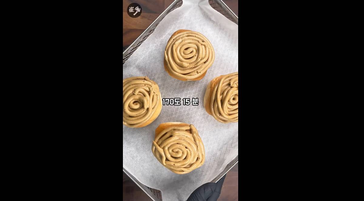 유튜버는 “만들어진 모카 필링을 모닝빵 위로 올려준 다음, 에어프라이어 170도에서 15분 돌려주면 모카번이 만들어진다고” 말했다.
