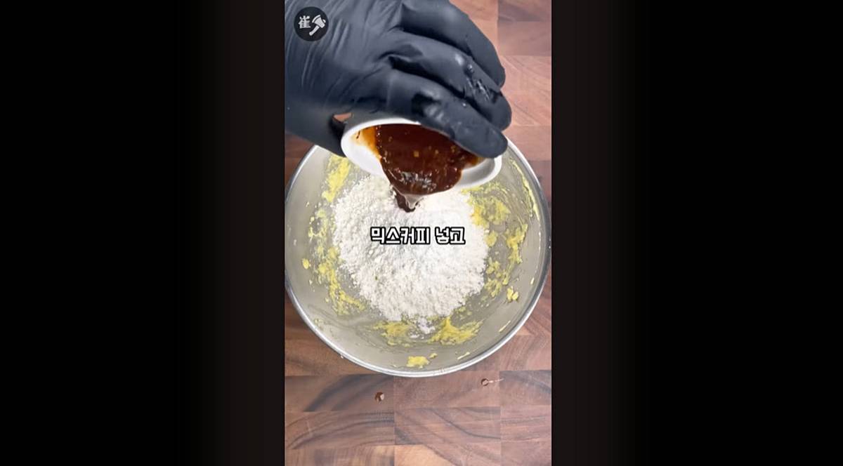 준비 과정은 생각보다 단순하다. 먼저 커피믹스 2개를 그릇에 붓고 뜨거운 물을 조금 넣어 녹인 뒤, 버터 60g과 설탕 30g을 넣어 섞는다. 여기에 계란 1개를 추가해 섞고, 박력분 50g과 앞서 녹여둔 믹스커피를 넣어 다시 섞으면 크리미한 모카 필링이 완성된다.