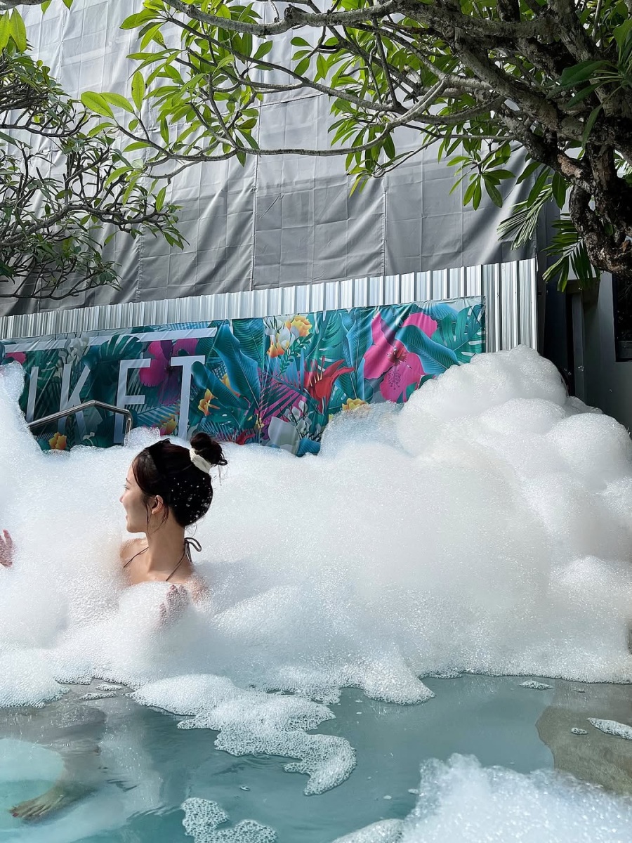 공개된 사진 속 오채이는 거품이 가득한 풀장에서 수영복 차림으로 물놀이를 즐기고 있다. 머리를 올려 묶은 채 장난스럽게 거품을 만지거나, 공을 들고 웃는 모습이 한낮의 활기를 더한다. 초록의 나무와 트로피컬 패턴의 배경, 햇빛에 반사되는 물결이 어우러져 휴양지 특유의 생동감을 완성한다.