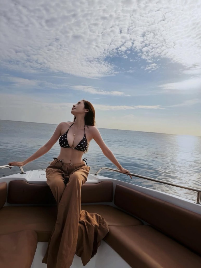 딥한 브라운 컬러에 화이트 도트(Polka Dot)가 들어간 비키니 탑으로 클래식한 매력을 뽐냈다.