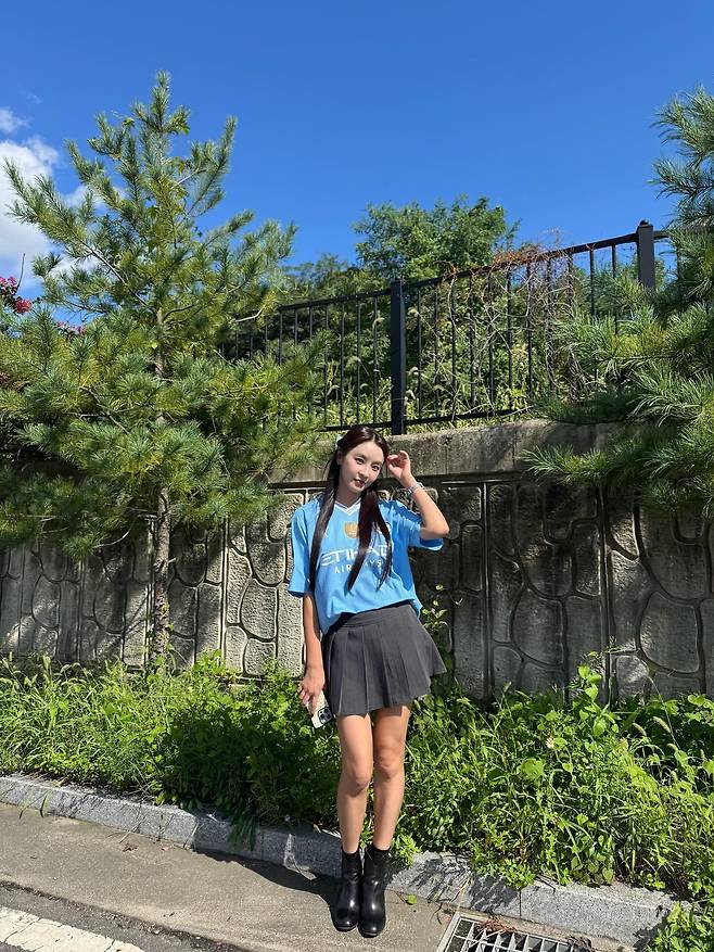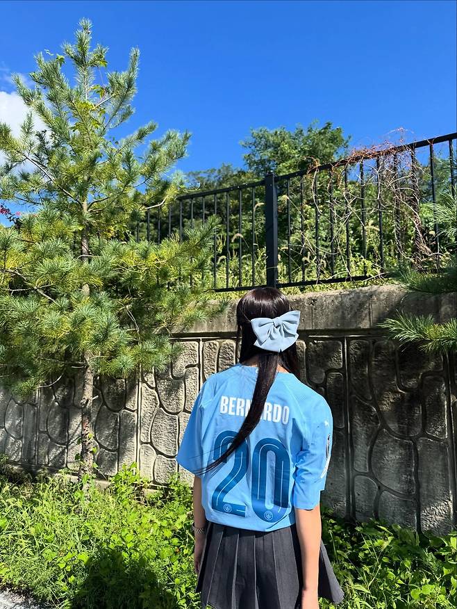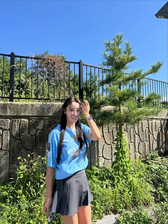 사진 속 정유미 씨는 하늘색 축구 유니폼에 테니스 스커트를 매치한 스포티한 차림에 허리까지 내려오는 긴 생머리를 선보였는데요.