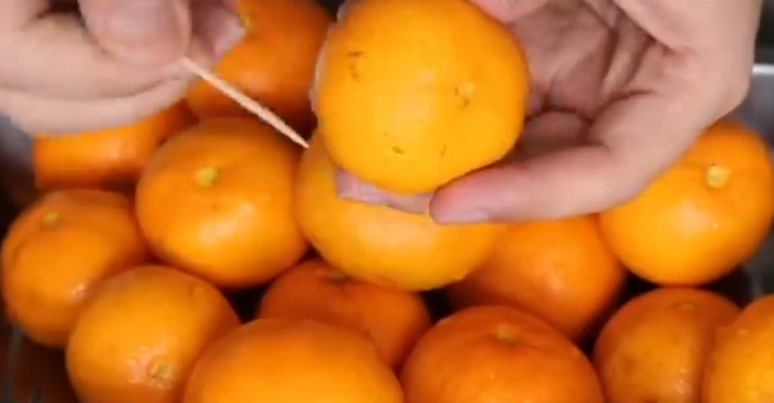 이 방법의 시작은 귤 손질이다. 귤은 껍질째 사용할 것이므로 흐르는 물에 문질러 깨끗하게 씻는다. 표면에 남아 있을 수 있는 이물질을 제거한 뒤 물기를 닦아낸다. 그다음 이쑤시개로 귤 전체를 골고루 찌르는데, 대략 열 번 정도가 적당하다. 너무 적으면 껍질의 쓴맛이 빠지지 않고, 너무 많으면 과육이 흐트러질 수 있다. 이 작은 구멍들이 끓는 과정에서 열과 수분이 안으로 들어가도록 도와 귤이 고르게 익게 만든다.