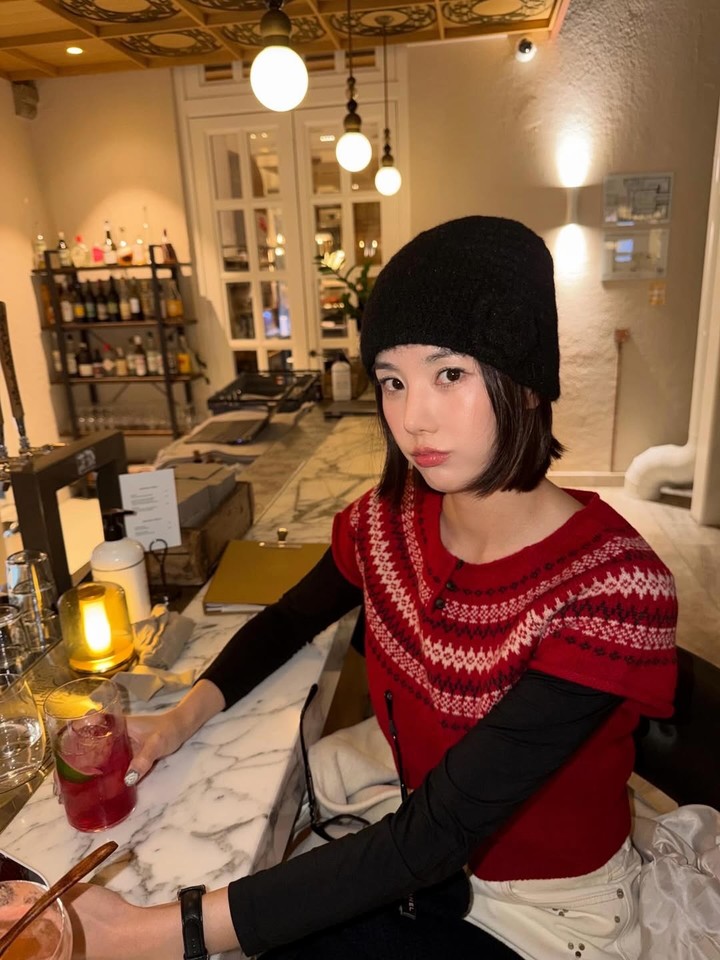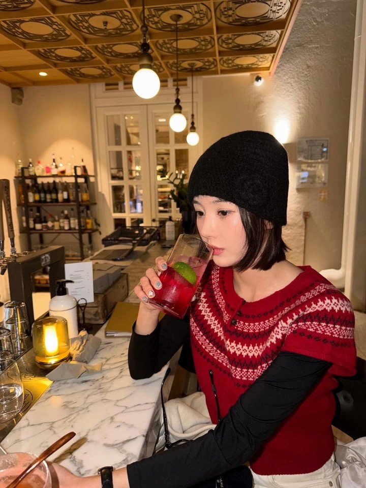 사진 속 권은비는 블랙 비니와 레드 노르딕 패턴 니트를 레이어드한 모습으로 포근한 분위기의 연말 데이트룩을 선보였다. 음료를 들고 있는 모습이나 일상적인 표정에서 자연스러운 겨울 감성이 느껴졌다.