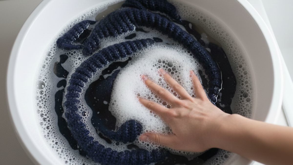 이제 줄어든 니트를 린스 물에 완전히 잠기도록 담근다. 이때 손으로 강하게 주무르지 말고, 섬유 사이로 린스 물이 충분히 스며들 수 있도록 가볍게 눌러준다. 약 15분에서 20분 정도 그대로 방치한다. 이 시간 동안 린스 성분이 섬유의 스케일을 유연하게 만들어 엉킴을 해제할 준비를 마친다.