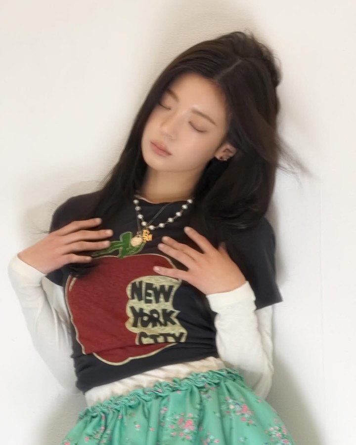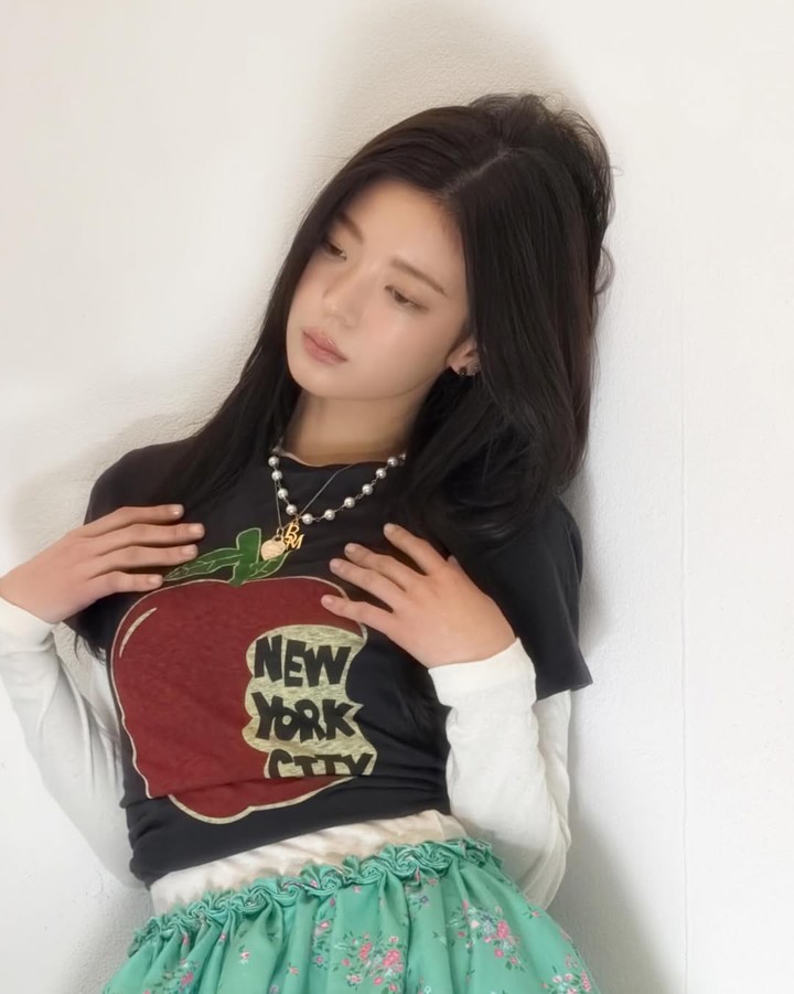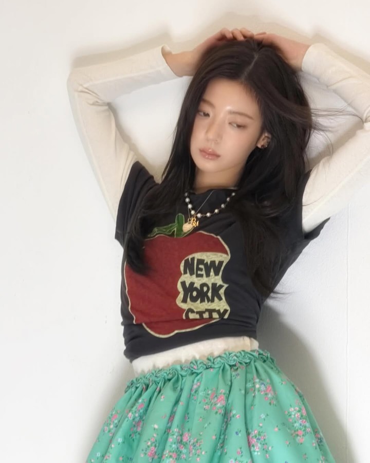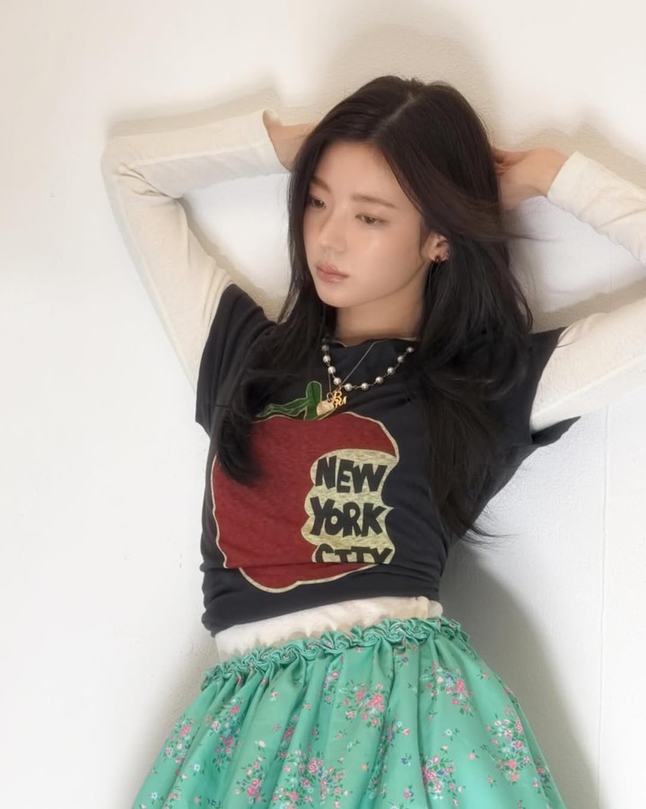 사진에는 화이트 이너와 프린팅 티셔츠를 겹쳐 입고, 민트빛 플로럴 스커트로 소녀스러운 스타일을 완성한 리아의 모습이 담겼다.