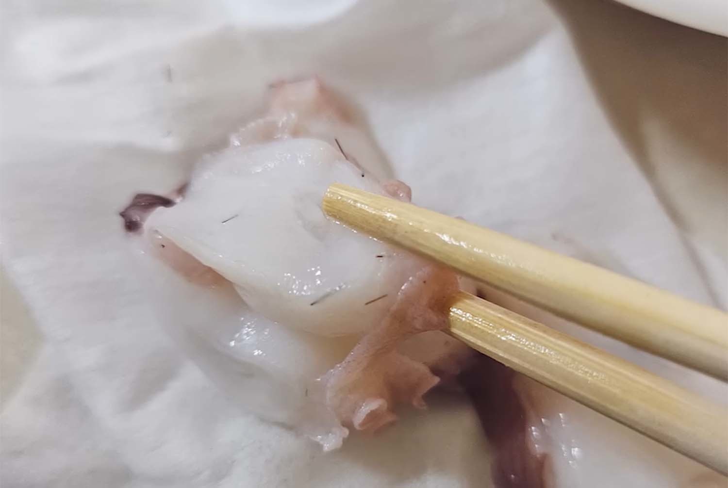 사진 속에는 문어 숙회에 검은색 선 같은 것이 콕콕 박혀 있었다. 머리카락처럼 보이지만 구부러지지 않고 끝이 날카로운 가시 같은 형태였다. 살뿐만 아니라 밑에 깔린 행주에도 떨어져 나간 가시들이 보였다.