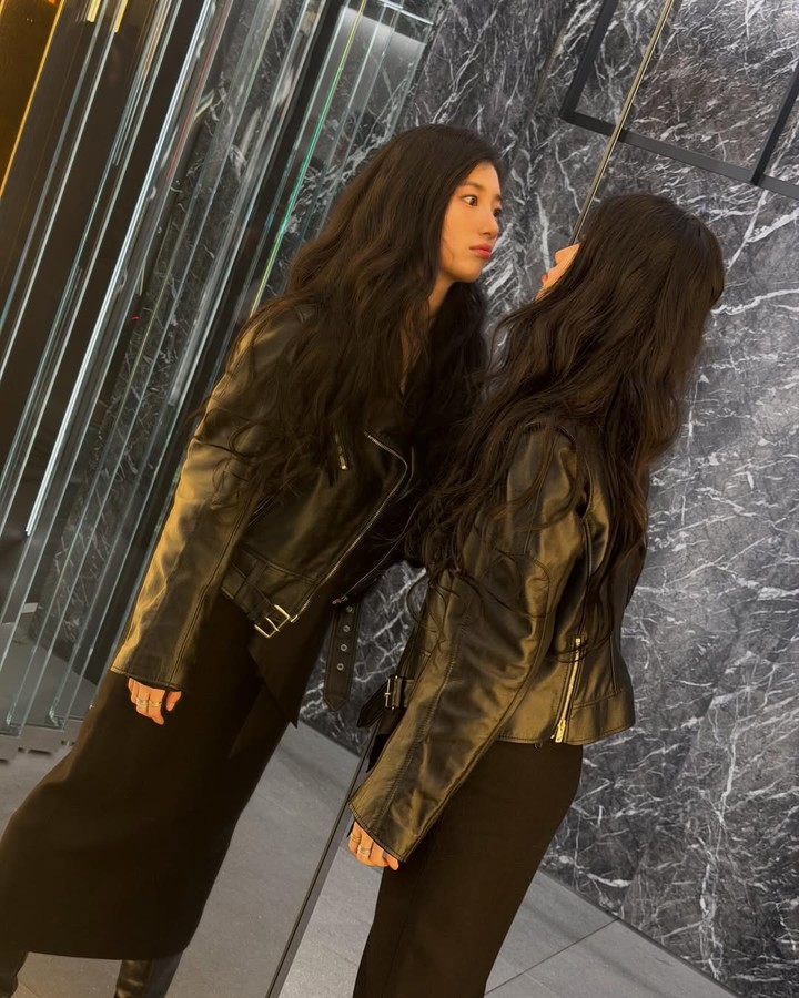 공개된 사진에서 수지는 블랙 레더 재킷과 일체형 블랙 이너를 입고 롱부츠와 함께 세련된 올블랙 룩을 완성했다. 이로 인해 도시적이고 세련된 무드가 강조됐으며, 단정하면서도 시크한 매력이 두드러졌다.