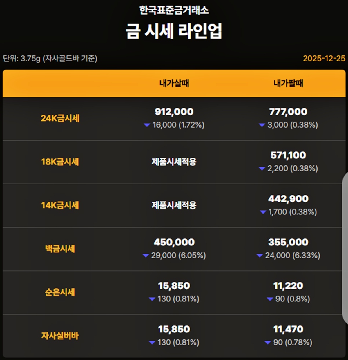 국내 거래소 금시세(금값)가 25일(한국 시각) 오후 급락세(전 거래일 대비)를 보이고 있다.