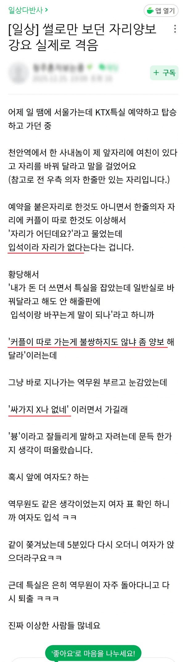 KTX 특실 자리양보 강요 썰 ;;