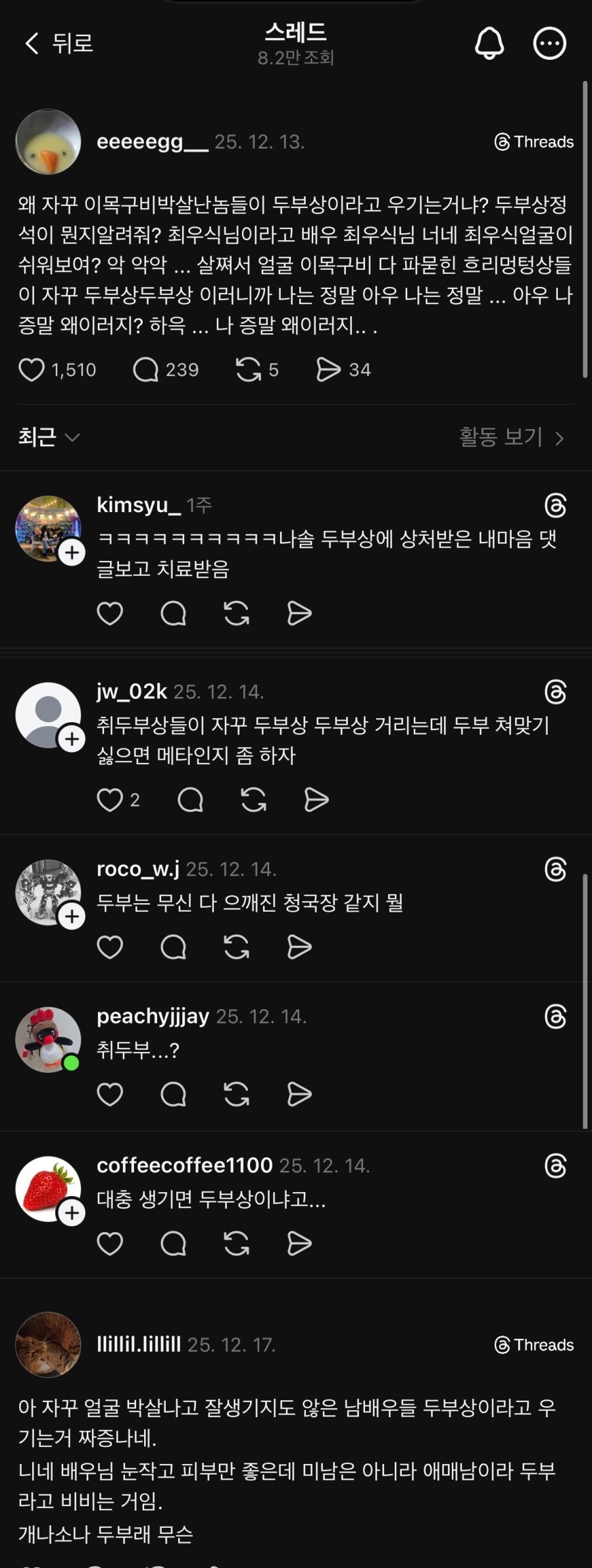 이목구비 뭉개진 생기다 만듯한 넘들이 개나소나 '두부상' 타령해서이젠 대놓고 거르는 단어가 되버렸다고 안성재 셰프 모수 100만원 크리스마스 코스 구성아동센터공익이 애들 데리고 게임 대회를 열어버림김부장 현실판이라는 다산신도시 상가들 상황매를 벌고 있다는 쿠팡 김범석 근황이런 걸로 이혼한다고 그러면 부모님이 이해해주실까