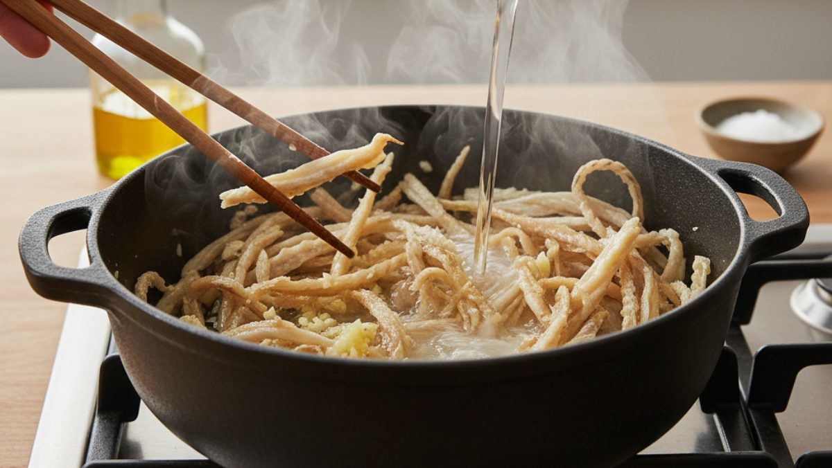 들기름에 충분히 볶기 냄비에 들기름을 넉넉히 두르고 손질한 황태채를 넣는다. 중불에서 황태채의 가장자리가 오므라들며 노릇노릇해질 때까지 충분히 볶는 것이 중요하다. 이때 다진 마늘을 함께 넣어 볶으면 마늘의 향이 기름에 녹아들어 국물의 비린내를 원천 차단할 수 있다.