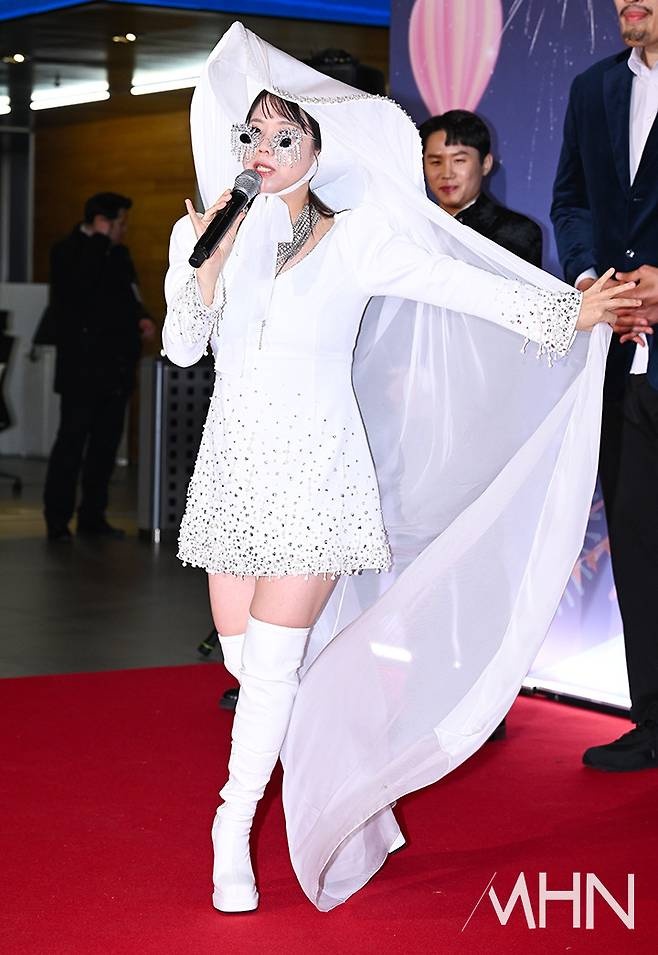 홍현희는 레드카펫 무대에 몸매를 강조하는 화이트 미니 드레스와 롱 베일을 매치해 많은 시선을 끌었다. 의상에는 반짝이 장식이 더해졌으며, 최근 10kg을 감량해 슬림해진 모습이 부각됐다.