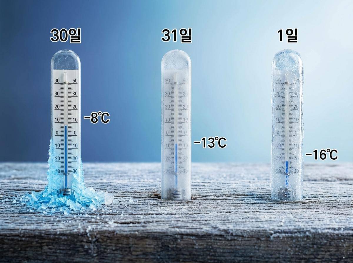 이 영향으로 기온은 하루가 다르게 떨어질 전망이다. 30일 아침 기온은 영하 8도에서 영상 3도 분포로 전국 대부분 지역이 영하권을 기록했다. 2025년 마지막 날인 31일 아침에는 영하 13도에서 영하 1도로 더 낮아지며, 전국 상당수 지역이 영하 5도 이하로 내려간다. 2026년 첫날인 1월 1일 아침 기온은 영하 16도에서 영하 4도까지 떨어져, 전국 대부분 지역이 영하 10도 안팎의 강추위를 겪을 것으로 보인다.