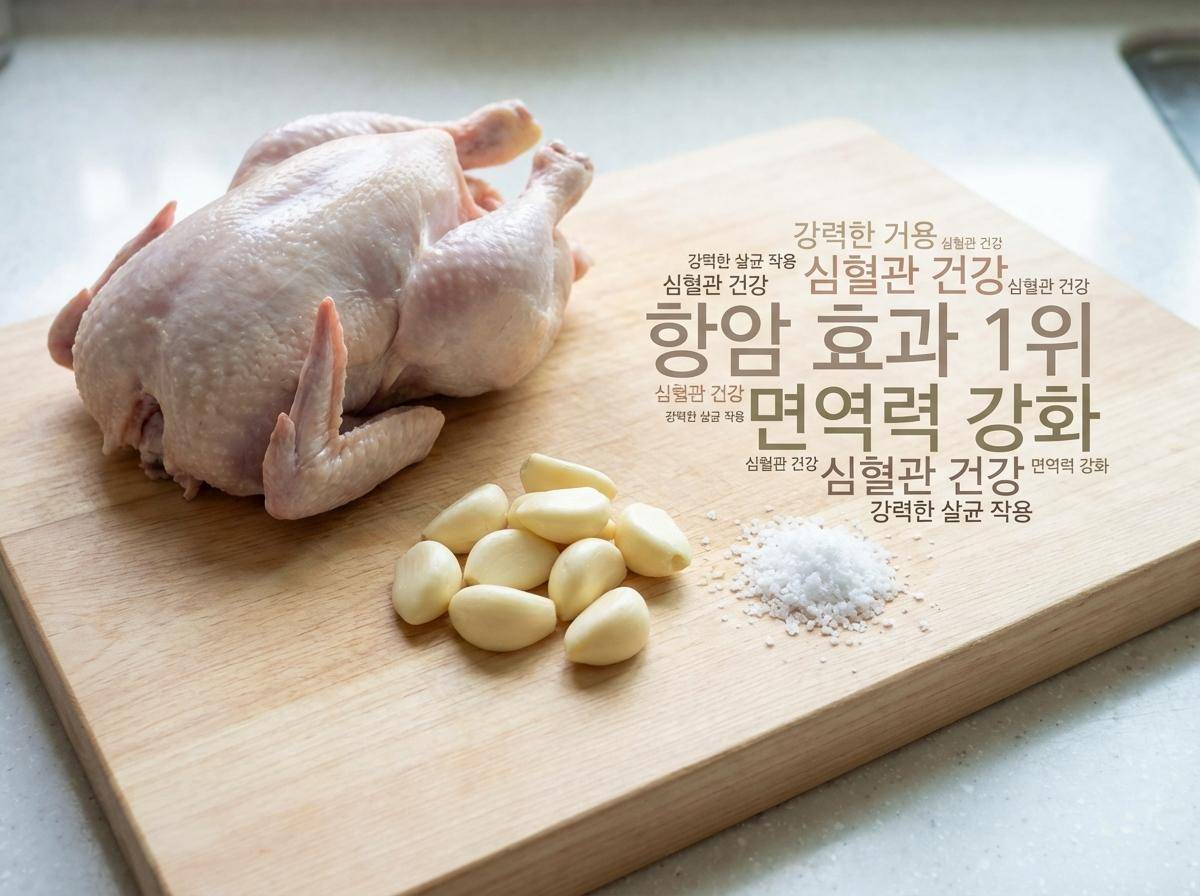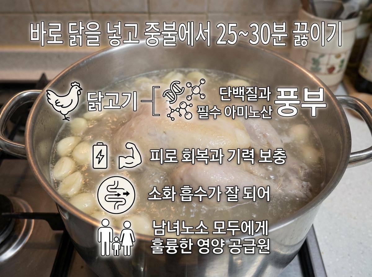 끓는 물에 마늘을 먼저 넣는 이유는 조리 시간 단축에도 있다. 마늘 향이 초반에 충분히 우러나기 때문에 오래 끓이지 않아도 국물에 깊이가 생긴다. 불필요하게 1시간 이상 끓일 필요가 없고, 닭 살이 퍽퍽해질 가능성도 줄어든다. 국물은 맑지만 밋밋하지 않고, 마늘 향은 나되 튀지 않는 균형을 유지한다.