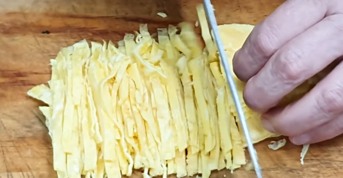 썰기의 핵심은 접는 방식에 있다. 지단을 여러 번 접어 한꺼번에 자르면 두께가 들쭉날쭉해진다. 한 장 그대로를 반으로 접거나, 말듯이 가볍게 접는 정도가 적당하다. 칼은 잘 드는 것을 사용하고, 눌러 자르지 말고 당기듯이 썬다. 이때 결 방향을 일정하게 유지하면 지단이 흐트러지지 않는다. 두께는 2밀리 정도가 가장 보기 좋고, 떡국 국물에도 잘 어울린다.
