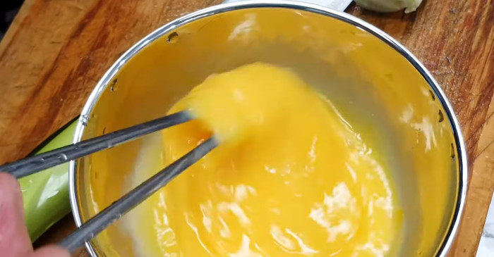 지단의 시작은 계란 풀기다. 계란을 풀 때 젓가락으로 세게 저으면 공기가 과하게 들어가 조직이 거칠어진다. 노른자와 흰자가 섞일 정도로만 부드럽게 풀어주는 것이 좋다. 이때 소금은 아주 소량만 넣는다. 간을 맞추기 위한 목적이 아니라, 계란의 색을 또렷하게 하고 조직을 안정시키는 역할이다. 물이나 우유를 넣는 경우도 있지만, 떡국용 지단이라면 계란만으로 충분하다.
