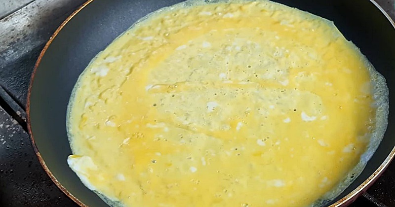계란물은 한 번에 붓되, 국자로 붓기보다는 팬을 살짝 기울이며 얇게 퍼지도록 한다. 이때 팬을 들고 계란물을 돌리듯 퍼뜨리면 자연스럽게 일정한 두께가 만들어진다. 너무 얇게 느껴질 정도에서 멈추는 것이 좋다. 익으면서 두께가 살아난다. 불은 계속 약불을 유지해야 하고, 계란물이 마르기 시작하면 팬을 불에서 잠시 내려 잔열로 익히는 것도 방법이다.