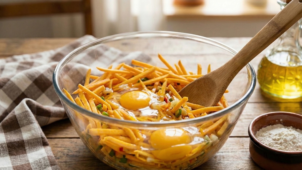 모든 재료가 준비되면 물기를 짠 고구마와 채 썬 어묵, 준비된 채소들을 모두 한 그릇에 담는다. 여기에 참치액젓 두 스푼과 후추를 약간 넣어 골고루 섞은 뒤, 감자 전분 두 스푼과 계란 두 개를 차례로 깨뜨려 넣어 반죽이 잘 어우러지도록 버무린다.