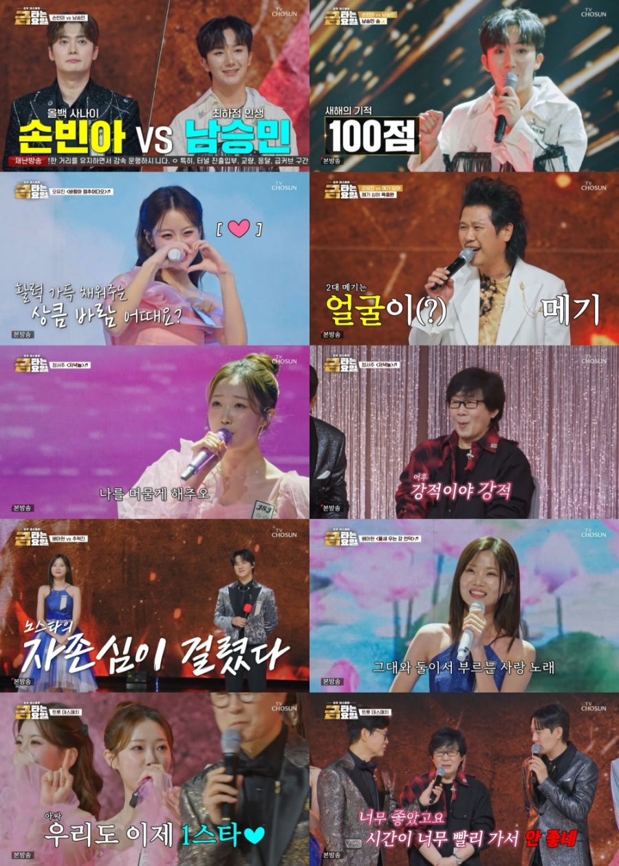 이날 방송에서 단연 눈길을 끈 인물은 진(眞) 김용빈이었다. 지난주 98점의 고득점을 기록하고도 1대 '메기 싱어' 양지은에게 밀려 아쉽게 황금별을 놓친 그는 이번 대결을 앞두고 "금을 타기 위해 금고까지 샀다"며 남다른 각오를 드러냈다. 이에 남승민은 "최근 용빈이 형 집에 갔는데, 금고 크기가 제 키만 하더라"고 폭로해 스튜디오를 술렁이게 만들었다. 김용빈은 곧바로 "쟤는 거짓말을 참 잘한다. 거짓말하니까 코가 피노키오처럼 된 거다"라고 받아쳐 유쾌한 티키타카를 완성했다. 두 사람의 절친 케미가 제대로 터진 순간이었다.