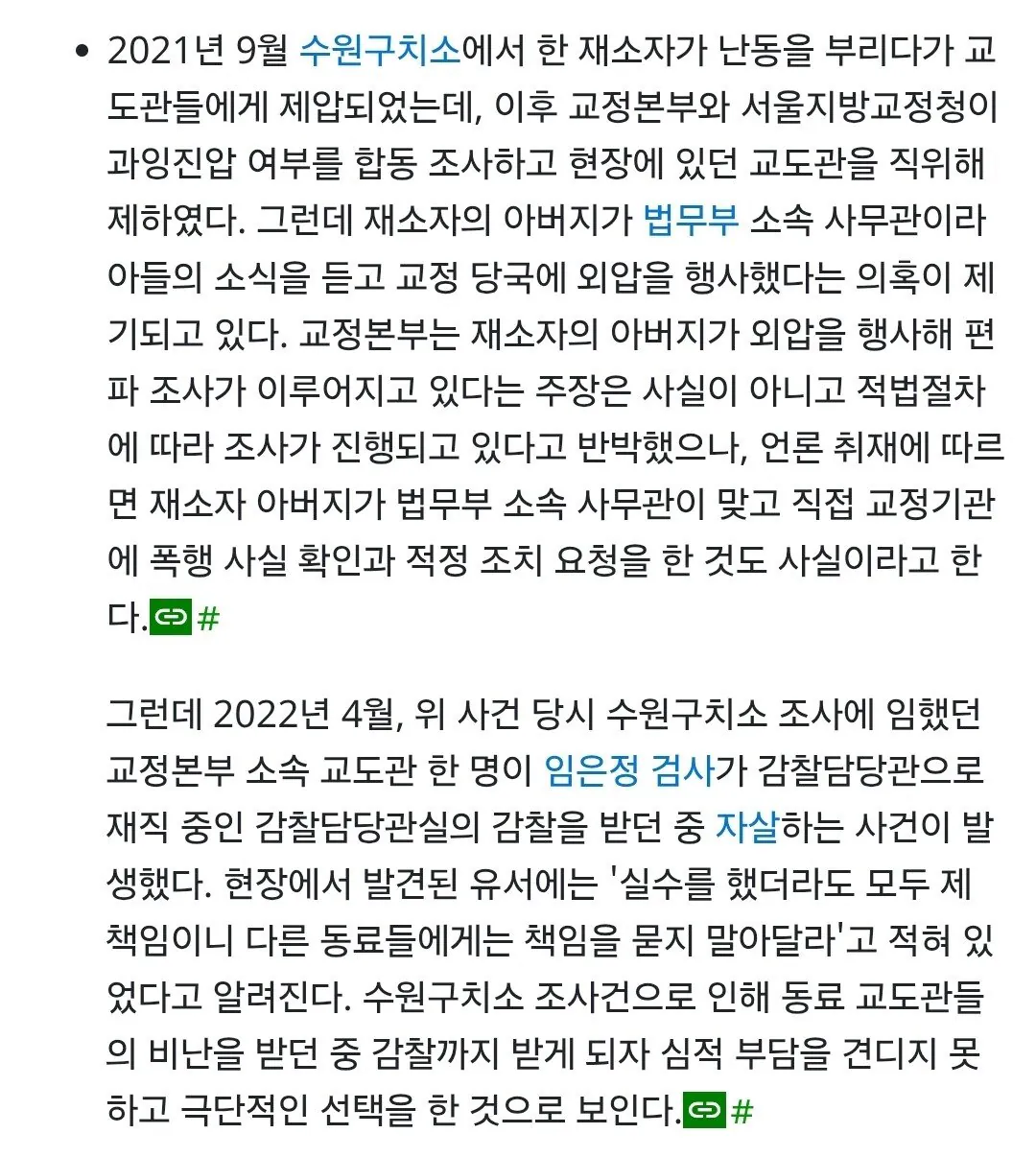 수원구치소에서 난동 부리기로 유명한 수용자가 있음 그 수용자가 또 난동을 부리자 교도관들이 제압함. 근데 그 수용자의 아버지가 법무부 사무관인데, 아버지가 교도관들이 폭력을 행사했다고 조사하라고 외압을 넣음. 결국 교정본부소속 교도관이 수원구치소 교도관들을 조사하였으나, 검찰에서는 무혐의로 결론 냈고, 수원구치소 교도관들은 자기들을 조사했던 교정본부 교도관에게 민원을 넣었고, 결국 민원에 견디지 못하여 자살함 교회를 지을 때 겁나 궁금했던 점여친이 범죄경력증명서 요구하네요카페 알바가 글 써줬는데 기분 나쁘면 이상함?필리핀 MZ세대들이 독재자 아들을 대통령에 뽑은 이유미국의 군사력 수준 맛뵈기