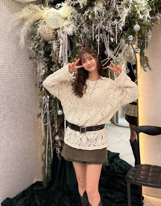 양손으로 브이를 그리며 밝게 웃는 그녀의 모습은 화려한 트리 장식보다 더 눈부신 존재감을 드러내고 있답니다.