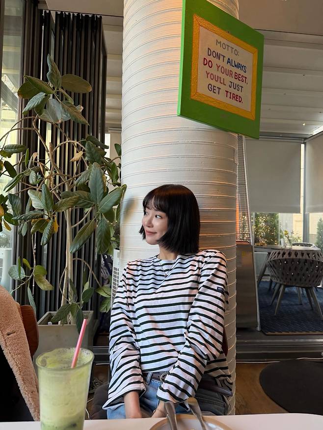 사진 속 이주연 씨는 가로 스트라이프 패턴의 티셔츠를 입고 기둥 옆에 앉아 어딘가를 응시하며 미소 짓고 있는데요.