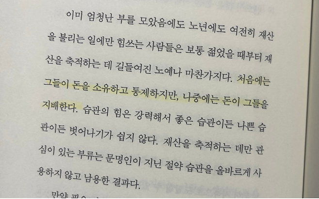 앤드루 카네기는 책 「어떻게 부를 얻을 것인가」에서 경고한다. “처음에는 사람이 돈을 소유하고 통제하지만, 나중에는 돈이 사람을 통제한다.” 돈이 삶의 주인이 되는 순간 선택은 줄어들고, 인생은 점점 조급해진다. 나이 들수록 반드시 버려야 할 것은 돈에 끌려다니는 태도다.
