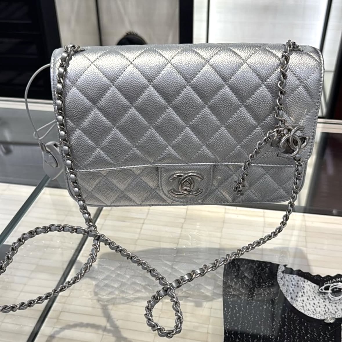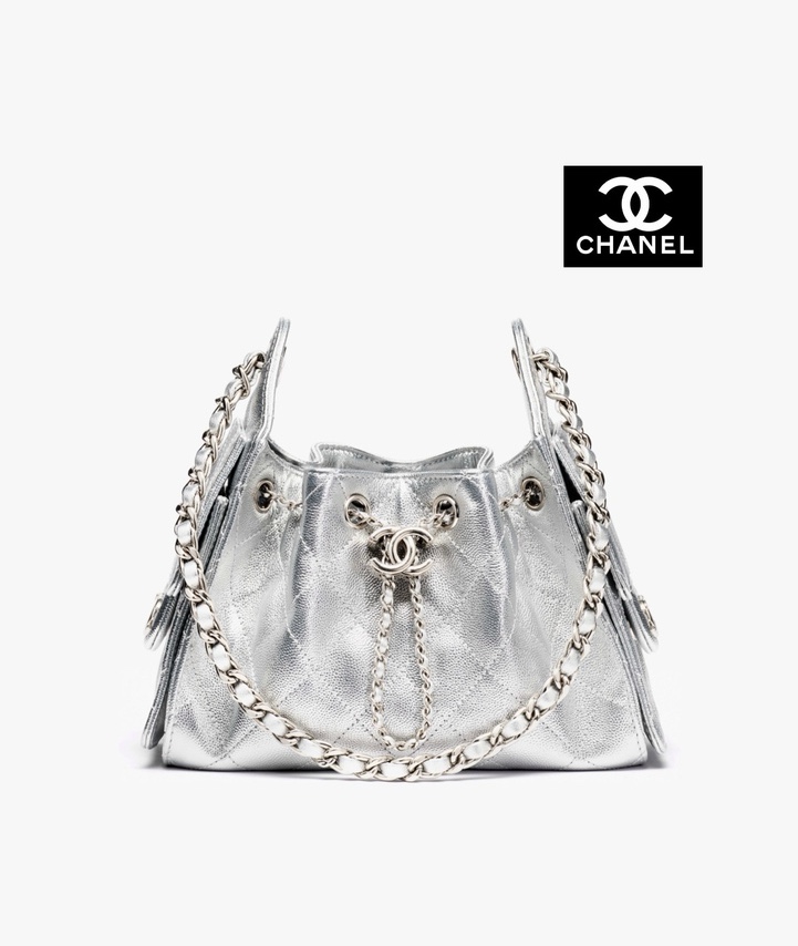 샤넬 25FW 25B 실버 플랩백 라지 CC로고 체인 조절 메탈릭 실버 캐비어 AS5756