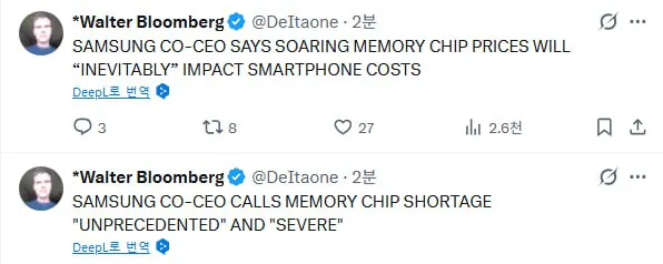 1. 메모리 가격이 스마트폰 가격에 "필연적으로" 영향을 줄 것 2. 메모리칩 부족이 "전례 없이" "심각하다" 스마트폰, 컴퓨터 가격은 근 몇년간 오늘이 제일 저렴할 예정 배민 NEW 빌런 등장얼마전 장애친구가 들어왔는데 저떔에 회사 관둔다네요 ㅠ삼성디스플레이 주름 없는 폴더블 패널 공개일반인들은 잘 모르는 실제 독수리 크기운전면허 시험 960번 떨어진 전설의 할머니