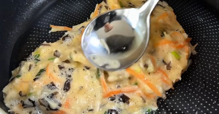 프라이팬은 중불로 달군 뒤 기름을 두른다. 기름이 너무 적으면 눌어붙고, 너무 많으면 계란이 튀겨지듯 익는다. 팬에 반죽을 올리면 주걱으로 살짝 눌러 두께를 고르게 만든다. 처음에는 손대지 말고 바닥이 충분히 익도록 기다리는 것이 중요하다. 가장자리가 노릇해지면 뒤집을 타이밍이다.