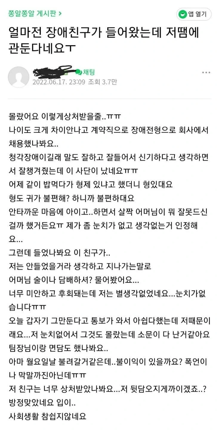 얼마전 장애친구가 들어왔는데 저떔에 회사 관둔다네요 ㅠ