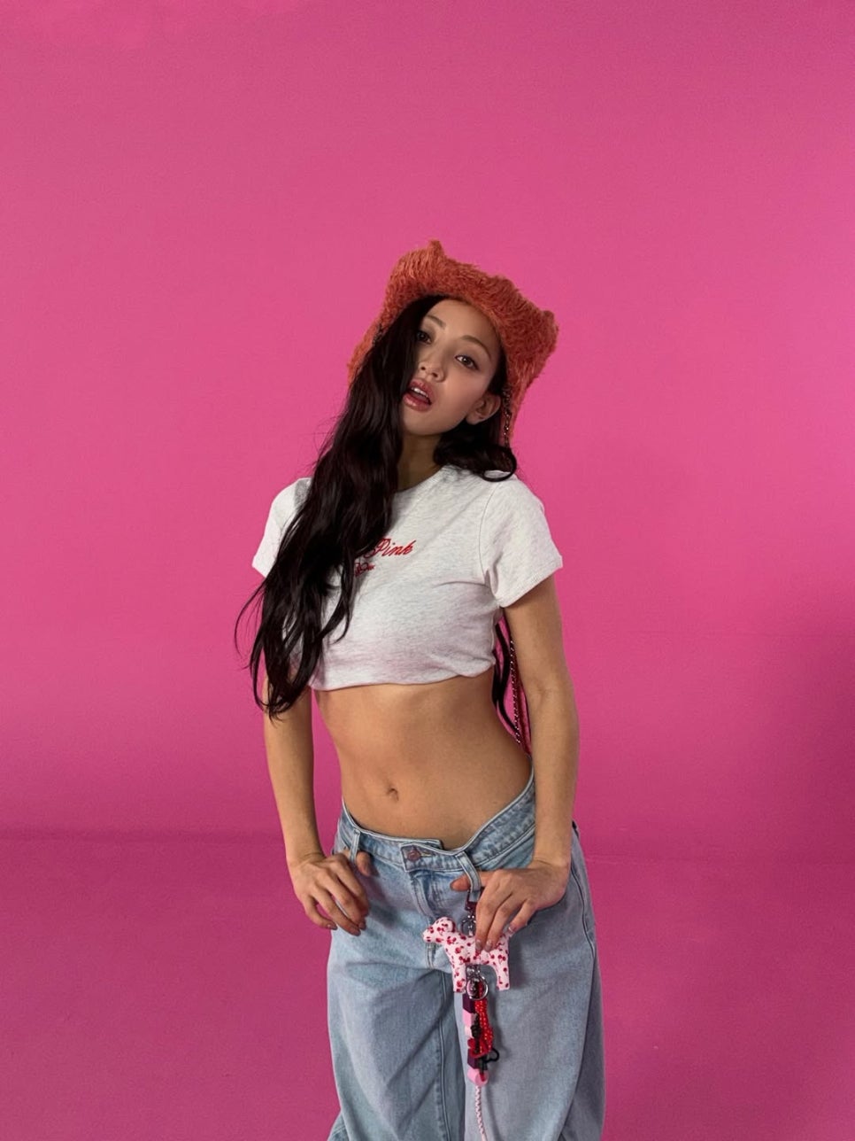 공개된 사진 속 지효는 화이트 크롭 티셔츠에