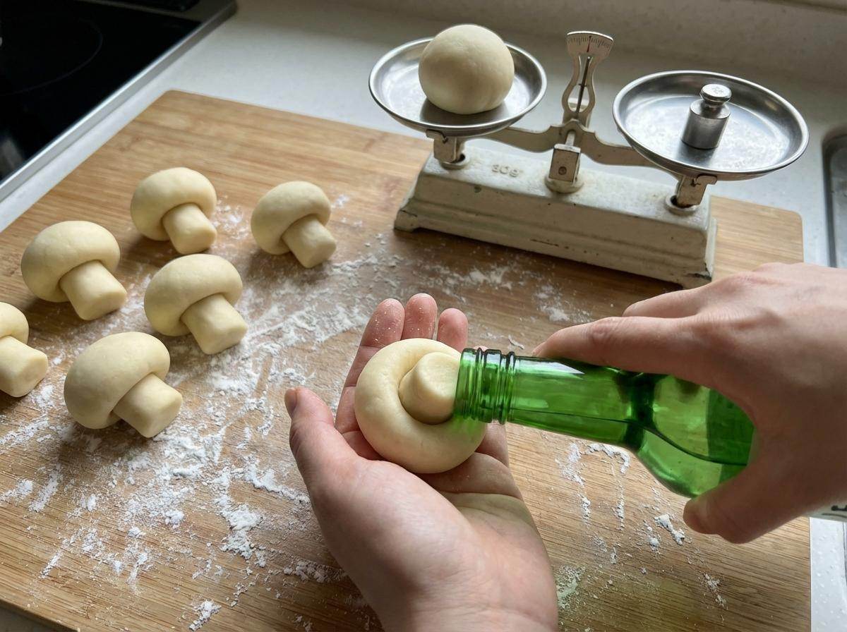 반죽을 30g 정도씩 떼어 동그랗게 만든 뒤 소주병 입구로 중앙을 꾹 눌러 모양을 낸다. 이 과정에서 감자가 양송이버섯처럼 오목하게 찍히는데, 데친 뒤 모양이 더 또렷해진다. 소주병 대신 좁은 병뚜껑을 써도 되지만, 입구 지름이 일정한 소주병이 가장 안정적이다.