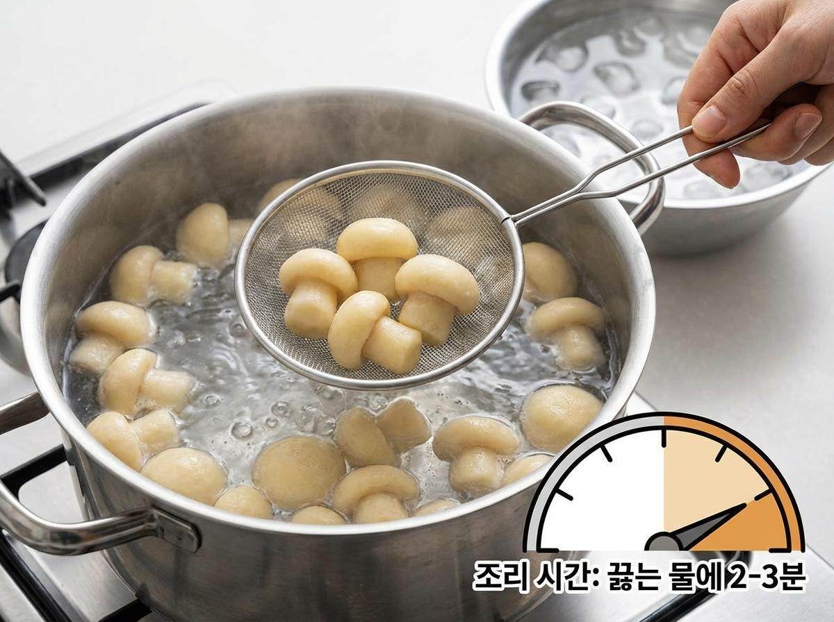 모양을 낸 반죽은 끓는 물에 넣어 2~3분 데친다. 바닥에 가라앉아 있던 감자가 위로 떠오르면 익은 상태다. 바로 건져 찬물이나 얼음물에 헹구면 표면이 탄탄해지면서 쫀득한 식감이 살아난다. 이 과정이 생략되면 양념에 버무릴 때 쉽게 부서진다.