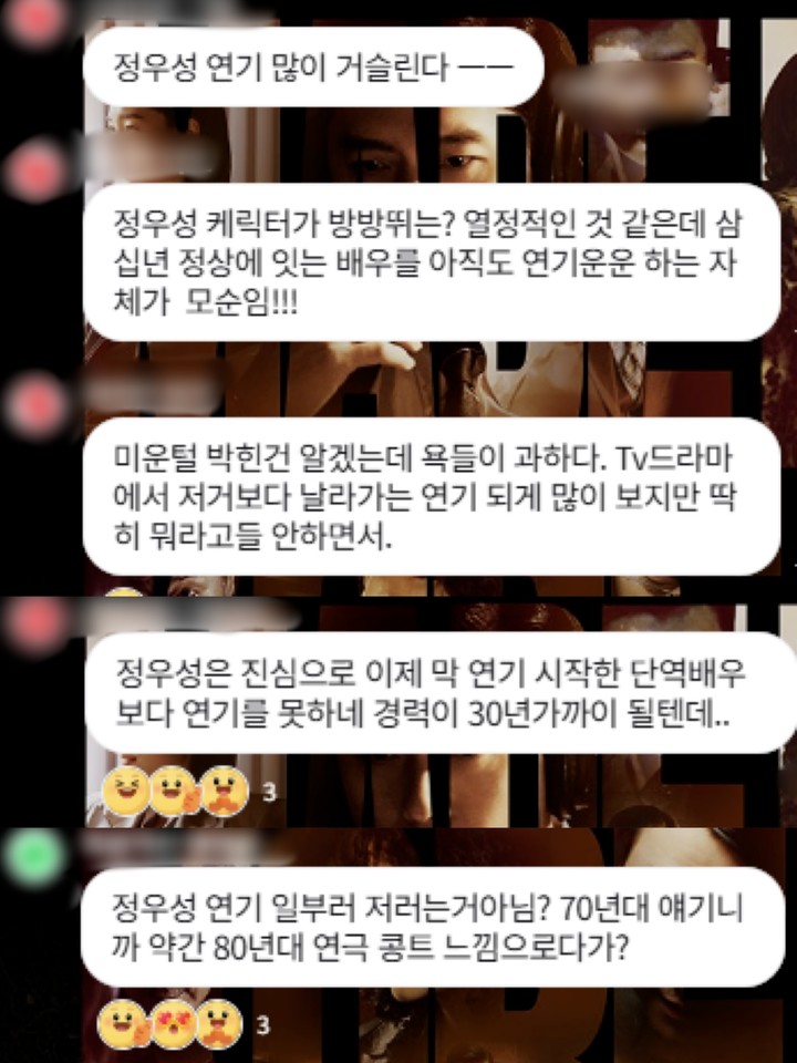 실제 온라인에서는 “정우성 연기 어색하다”, “30년째 연기톤이 똑같다”, “미스캐스팅이라는 비판이 나올 만하다” 등 부정적 평가가 이어졌다. 이에 맞서, “시대적 분위기에 맞춘 의도된 연기 아니냐”, “캐릭터 차별성이 작품에 활력을 더한다”, “연기력을 문제 삼는 건 지나치다” 등 옹호 의견이 나와 논쟁이 뜨거워졌다.