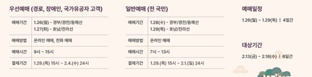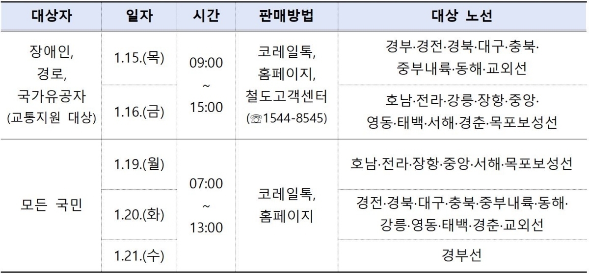 전 국민 대상 예매는 28~29일 이틀간 오전 7시부터 오후 1시까지 진행된다. 28일에는 경부·경전·동해선 열차 예매가 열리고 29일에는 호남·전라선 열차 예매가 진행된다.