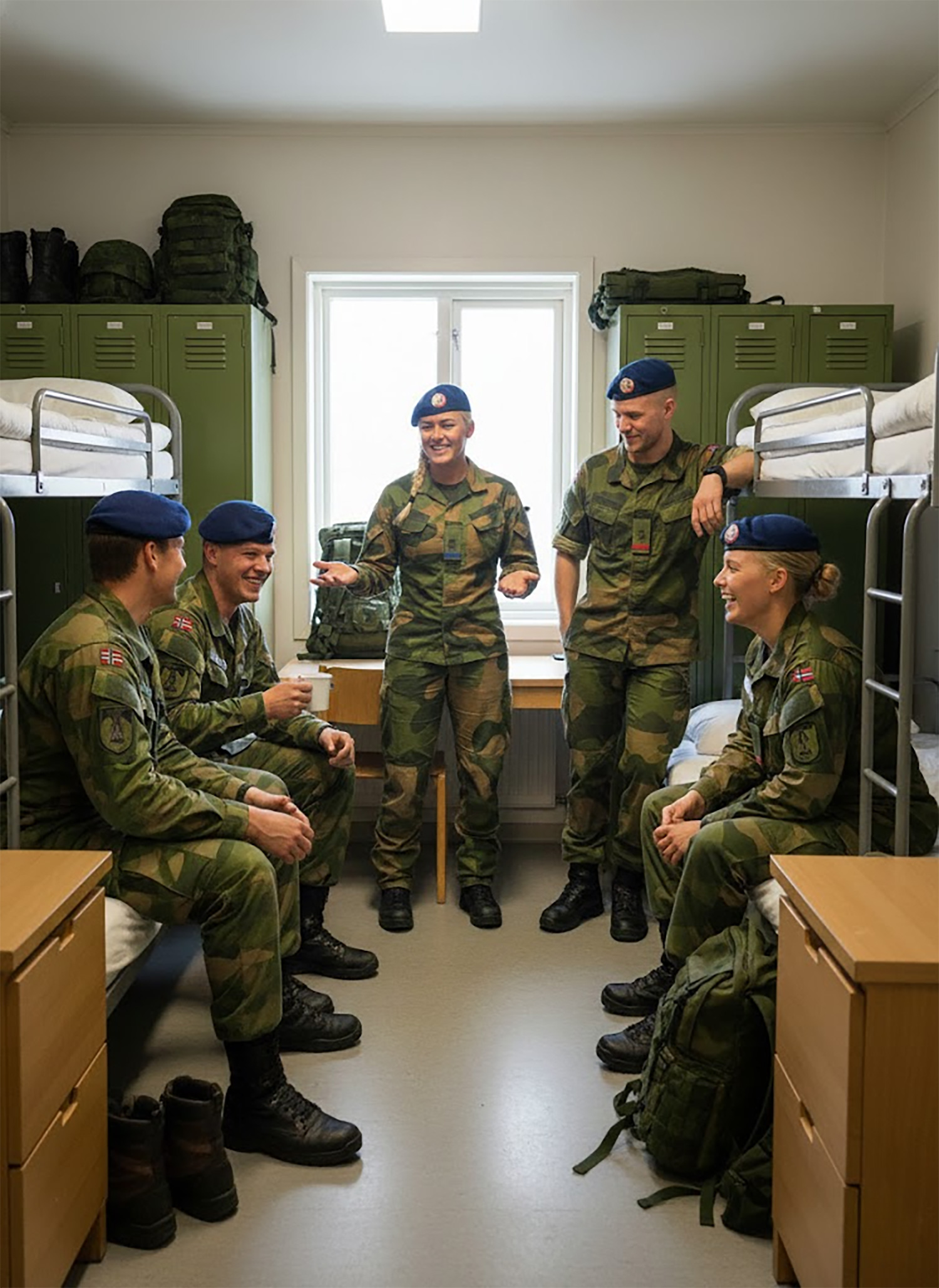 노르웨이 모델의 가장 큰 특징은 남녀가 한 공간에서 생활하는 ‘유니섹스(Unisex) 생활관’이다. 통상 남성 4명과 여성 2명이 한 개 생활관에 배치되는 이 파격적인 운영은 도입 당시 우려와 달리 성 관련 범죄를 억제하는 뜻밖의 효과를 거두었다.