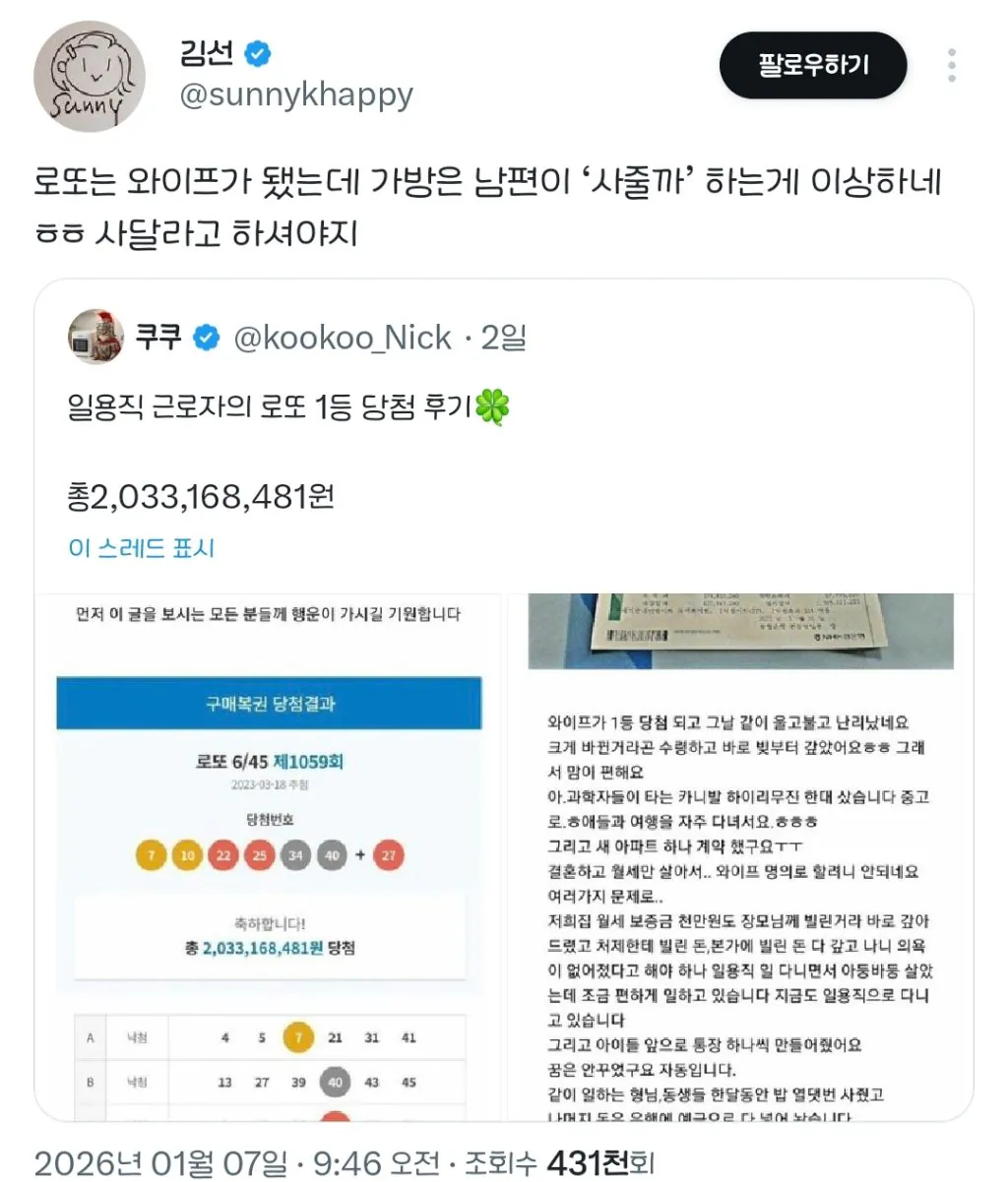 로또는 와이프가 됐는데 남편이 ‘가방 사줄까...’