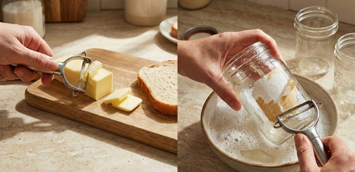 조리 과정에서도 감자칼의 진가는 드러난다. 바로 '버터'를 이용할 때다. 딱딱하게 굳은 버터를 사용할 때 간단히 감자칼로 얇게 슬라이스해보자. 스푼이나 칼을 이용할 때보다 훨씬 얇고 넓게 자를 수 있다. 김자칼로 슬라이스한 버터를 식빵 위에 고르게 올려 구우면, 타지 않으면서도 버터 풍미를 전체적으로 느낄 수 있다.
