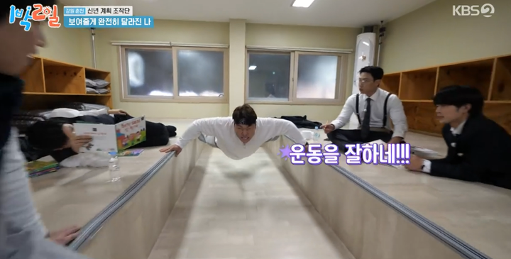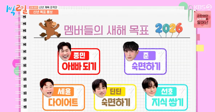 김종민에게는 ‘아빠 되기’, 이준은 ‘숙면하기’, 딘딘은 ‘성장하기’, 문세윤은 ‘다이어트하기’, 유선호는 ‘지식 쌓기’가 새해 목표로 선언됐다. 이에 따라 이준은 숙면 관련, 딘딘은 서전트 점프 업그레이드 미션을 각각 받았다.