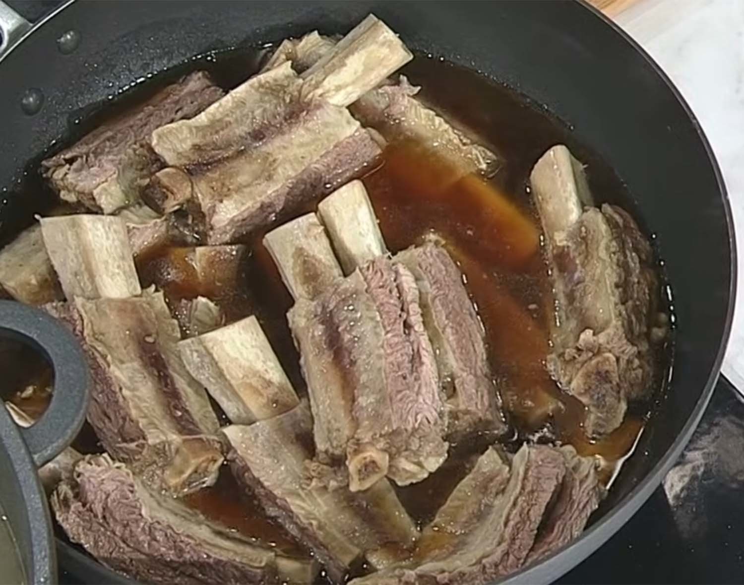 여기서 임성근만의 특급 비법이 등장한다. 갈비를 양념에 조려서 넣는 것이다. 팬에 진간장 100g(반 컵), 황설탕 4큰술, 후추 한 꼬집, 갈비 삶은 육수 3컵 반~4컵, 소주 한 잔을 넣고 갈비와 무를 넣어 10~15분간 조린다.