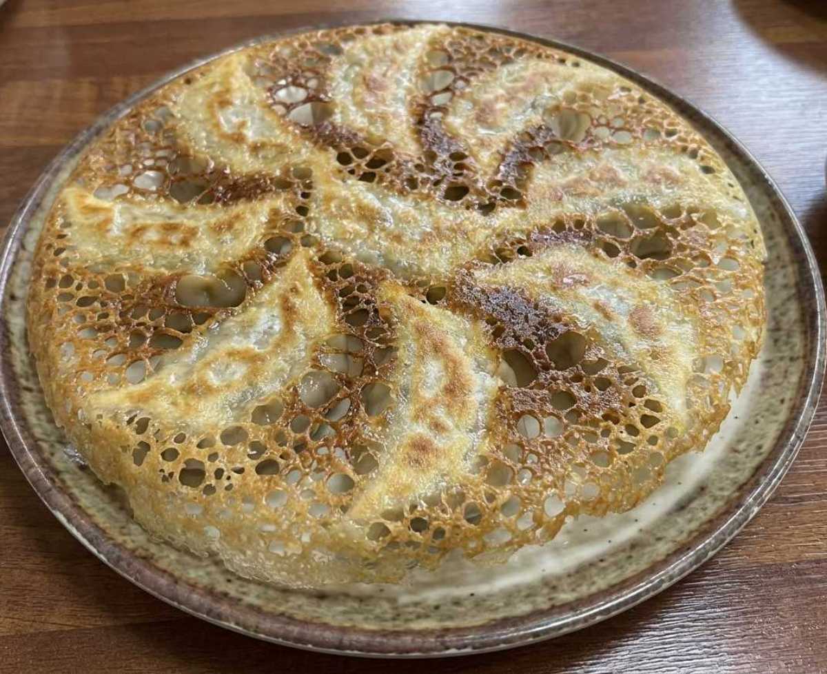 물이 모두 날아가면 불을 끈다. 이때 뚜껑을 열면 위쪽 만두는 찐 것처럼 촉촉해져 있고, 아래쪽은 얇고 바삭한 판이 형성돼 있다. 팬 위에 접시를 대고 그대로 뒤집으면 한 장으로 붙은 만두가 통째로 옮겨진다. 바닥은 빠삭하게 부서지고, 안쪽은 부드럽게 익은 반반 구조가 완성된다.