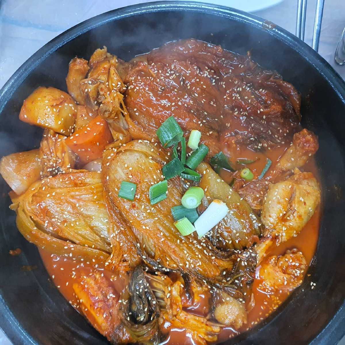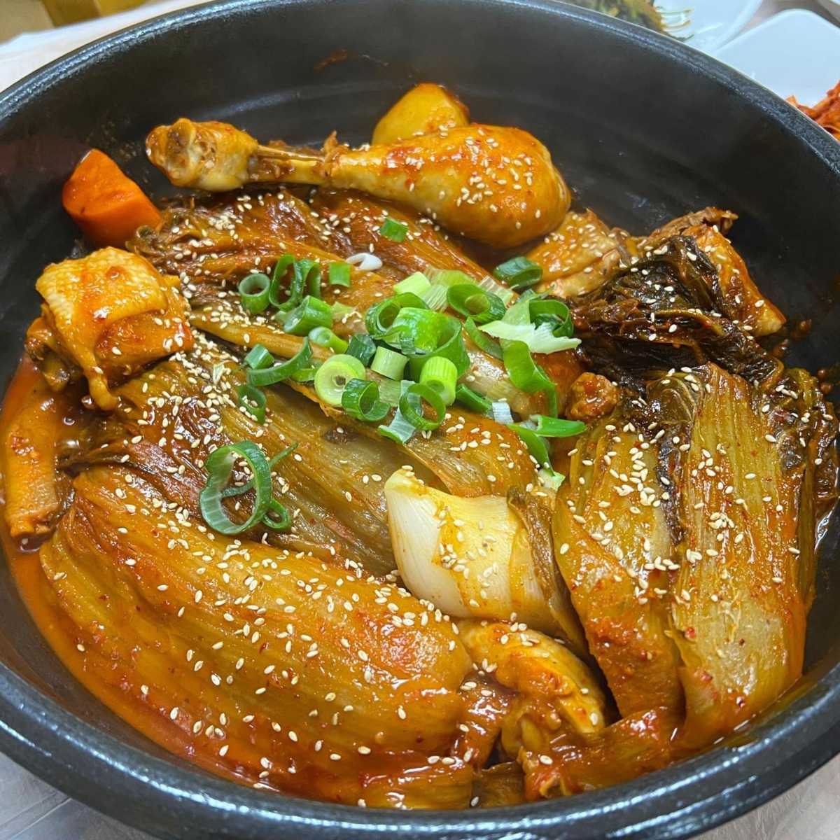 군침 돌게하는 비주얼의 묵은지 닭볶음탕 맛집 완주 ‘대승가든’. 직접 기른 토종닭과 3년 숙성된 묵은지로 요리하는 집으로 얼큰하고 시원한 국물이 일품이다. 걸죽한 국물의 다른 닭볶음탕과는 다르게 자극적이지않고 맑고 고소한 국물이 특징. 쫄깃한 식감과 구수한 맛을 위해 한약재를 먹여 직접 키운 토종닭과 전라도 김치의 명성을 그대로 따른 김치는 감칠맛과 풍미가 더해져 한 냄비에서 잘 어우러진다. 농사지은 완두콩을 넣고 지은 솥밥은 밥맛에서부터 맛집임을 증명한다.