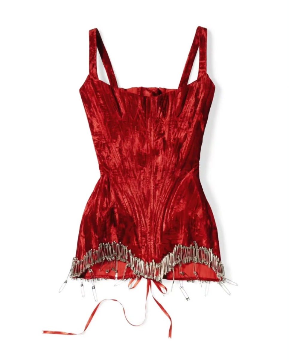 Shield Dress — 강렬한 레드 벨벳 소재에 코르셋 구조가 포인트인 드레스입니다.