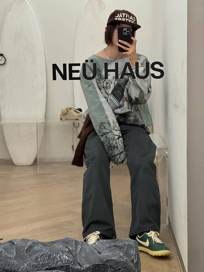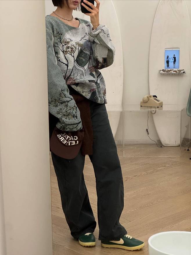 톤 다운된 그린 컬러의 나이키 운동화와 브라운 캡모자가 니트 속 그래픽과 자연스럽게 어우러져 전체적인 룩에 통일감을 주거든요.