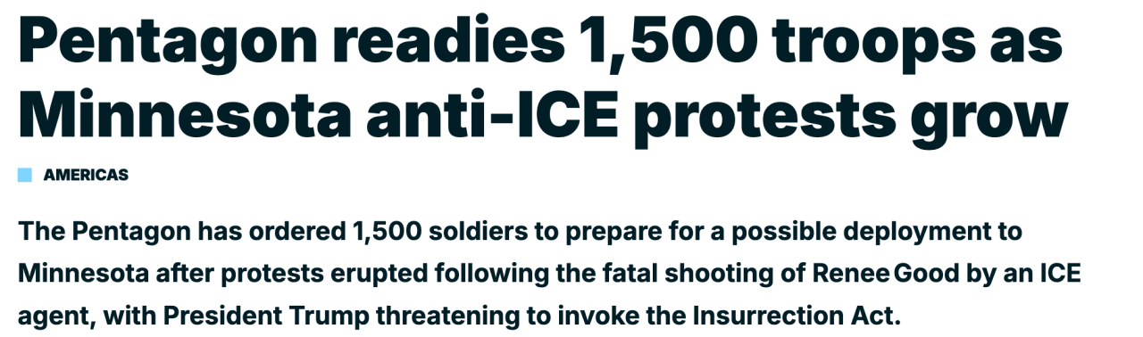 펜타곤이 알래스카 주둔 공수부대 1500명 투입준비 시킴 ICE에 맞서서 주와 시경찰 보조하도록 명령 문제는 주방위군의 경우 대통령 명령으로 연방군으로 바뀔수 있다는 거 중국 재생 에너지 발전 근황공감 능력 하나는 매우 뛰어난 디시인칼퇴근으로 해고 당했다는 알바생사람들이 30대로 본다는 42세 유튜버1월말까지 역대급 추위 예정