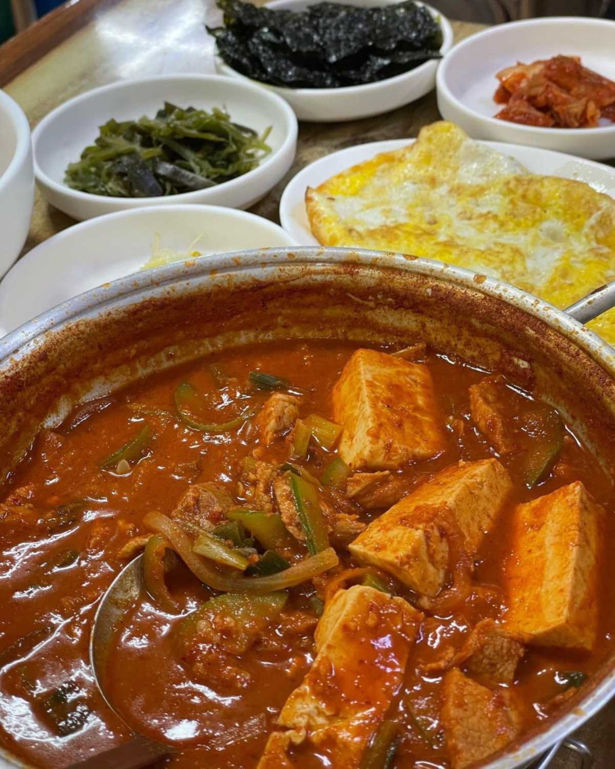 ‘엄마네돼지찌개’는 찌개와 짜글이의 중간 느낌으로, 돼지고기, 파, 양파, 두부 등이 들어 있는 매콤한 찌개이다. 단일 메뉴 하나로 유명해진 곳이며 한 입 먹으면 혀 끝부터 얼얼함이 밀려온다는데. 매운 맛 조절이 불가한 곳이지만 밥에 참기름과 콩나물 등을 넣어서 비벼 먹으면 어느정도 가감된다. 두툼한 계란 부침과 함께 먹으면 고소함이 더해지지만 그래도 매운 돼지찌개. 매운 맛을 즐기는 사람이라면 꼭 한 번은 가봐야 하는 곳이다.